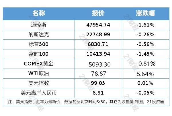 隔夜外盘纽约股市三大股指3月5日下跌。截至当天收盘,道琼斯工业平均指数比前一交易日下跌784.67点,收于47954.74点,跌幅为1.61%;标准普尔500种股票指数下跌38.79点,收于6830.71点,跌幅为0.56%;纳斯达克综合指数下跌58.49点,收于22748.99点,跌幅为0.26%。