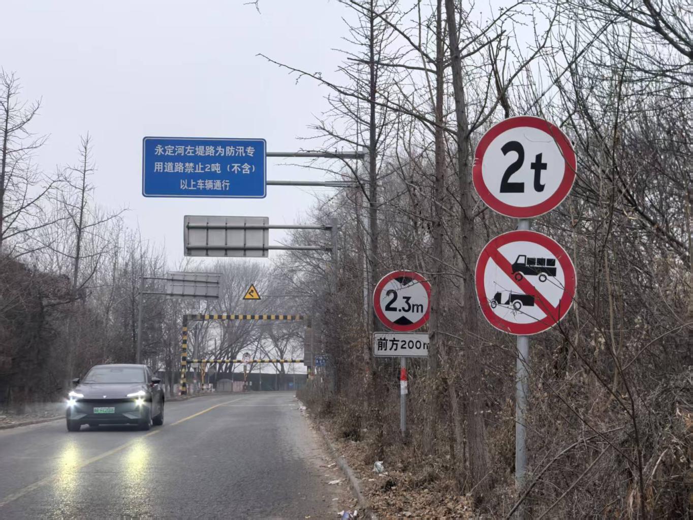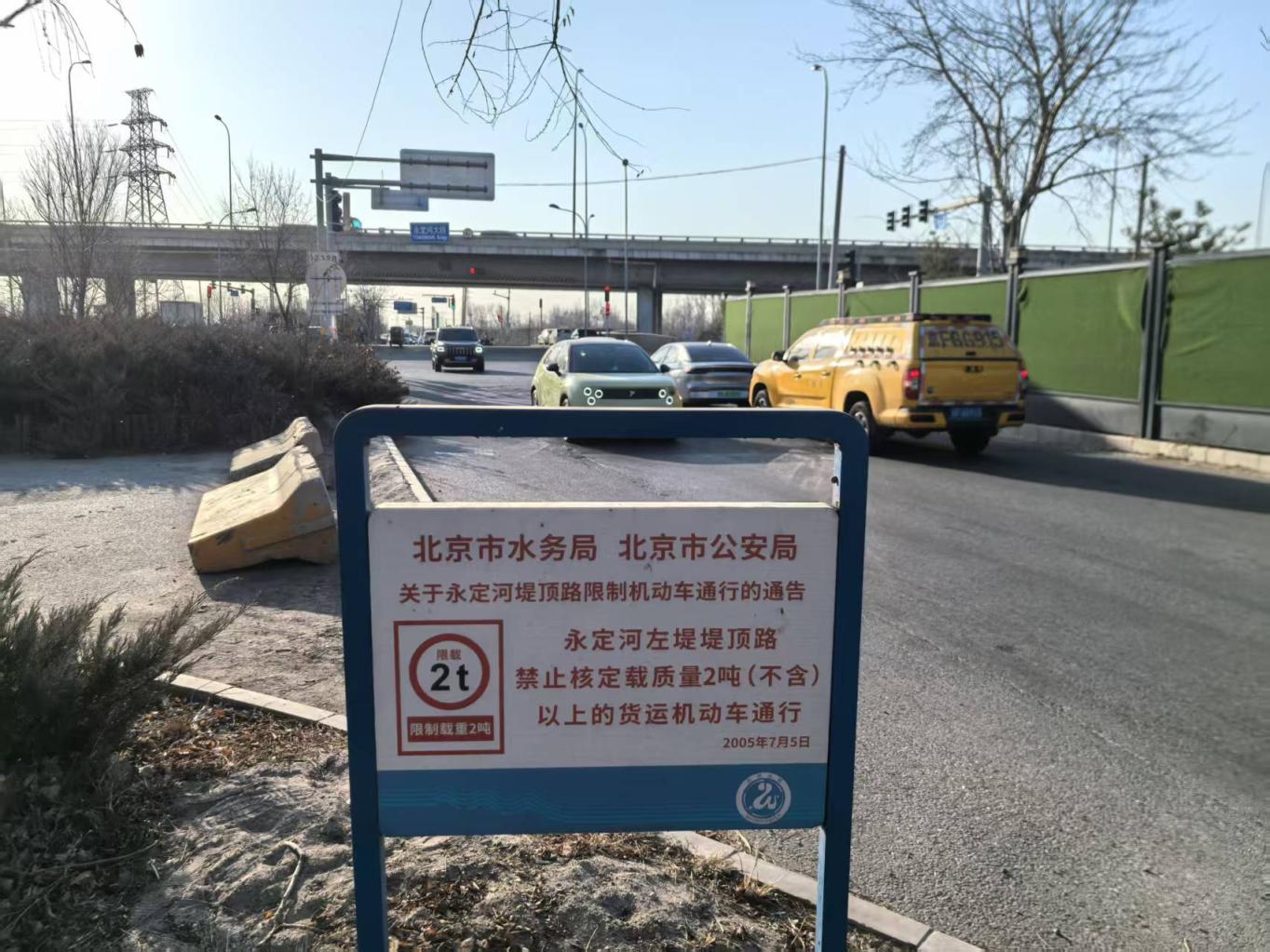 2025年12月18日16时许,记者驶出G106国道来到左堤路,只见路口高高挂着蓝底白字的牌子,上面写着“永定河左堤路为防汛专用道路禁止2吨(不含)以上车辆通行”。在道路右侧,“禁止大货车”“限高2.3m”等提示牌十分醒目。