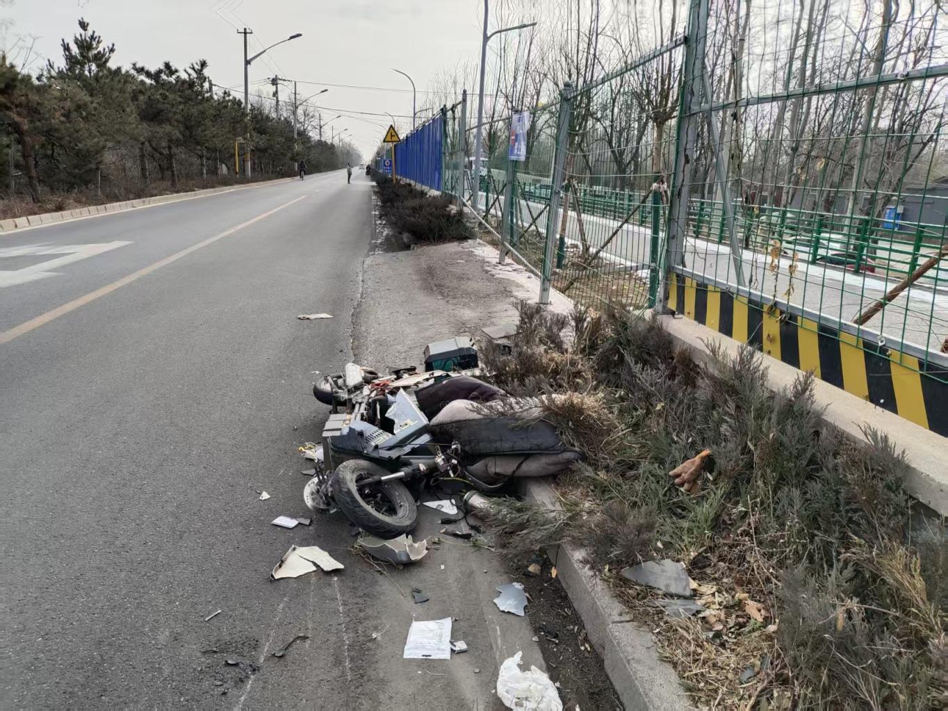 齐庄公交站北侧,一辆摩托车被机动车撞碎。