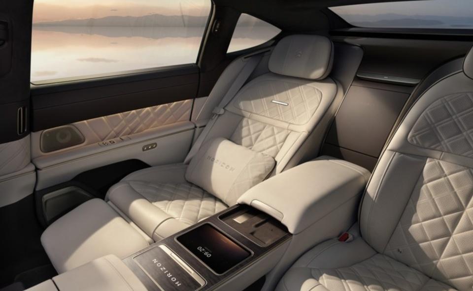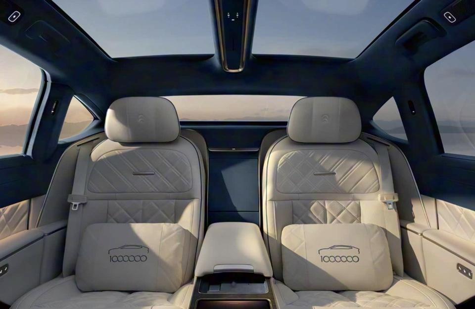 内饰以豪华舒适为核心,配置全面升级。15.6英寸3K AMOLED中控屏与1.4米天际氛围灯带营造科技座舱氛围,AR-HUD全焦段投影整合导航信息,配合ARNC主动降噪与5层隔音玻璃,静谧性大幅提升。采用“2+2”四座独立布局,配备前后座椅通风/加热/按摩功能,后排支持45°躺倒与全向调节,搭配刺绣工艺腰枕,带来极致乘坐体验。中控台内嵌10升车载冷暖冰箱,满足高端用户日常需求,车内还配有铑金臻藏徽章,彰显限量身份。