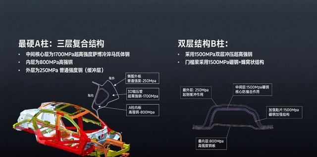 车身结构上,600MPa以上高强度钢占比提升至53%,A柱采用1700MPa超高强度萨博冷淬马氏体钢三层复合结构,B柱则使用1500MPa双层冲压超高强钢。