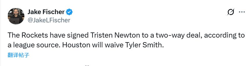 北京时间1月4日,据名记Fischer报道,火箭已与特里斯滕-牛顿签下双向合同,他们将裁掉泰勒-史密斯。随后名记Scotto表示,牛顿本赛季至今效力于G联赛的爱荷华狼队效力,场均得到26.8分,投篮命中率为49.4%,三分球命中率为37.6%,此外还有7.7次助攻、4.9个篮板和1.7次抢断。